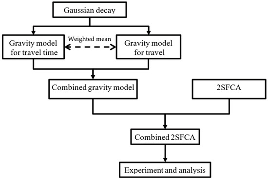 This study is an extension of the 2SFCA method. First, the gravitational models of travel time and travel distance are constructed separately using the Gaussian decay model. Then, gravity models of travel time and travel distance are combined into a weighted mean to construct a combined gravity model, and the new combined 2SFCA is implemented. Finally, it is verified and analyzed by specific experiments. Figure 1 shows the flow chart of this study.