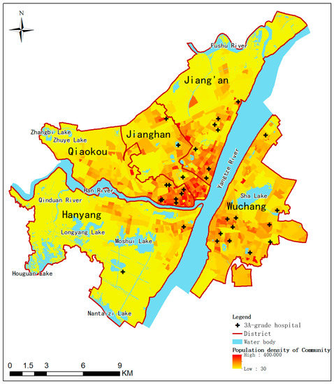 Figure 2 shows the spatial distribution of the district, community, population density and 3A-grade hospitals (3AH) of the study area. The 3AHs are the highest level of hospital in China, and they excel in healthcare services and management, quality and safety of care, and technical proficiency and efficiency. The density of population and 3AHs near the intersection of the Yangtze River and Han River are the highest, especially in Qiaokou, Jianghan and Jiang’an district.
