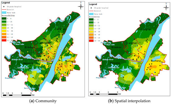 In the real world, it is common for different communities to cover different sized areas. For example, in general, the further away from the city center, the larger the area covered by the community. In terms of spatial distribution, any two points within a small community are closer, so internal accessibility is less affected by distance. In addition, its accessibility is finer than that of a large community because no other processing is required, and the calculation results are used directly for visualization, which is more realistic. However, this method ignores the influence of distance and is not suitable for situations with large differences in the area of basic units. For example, for a large community, it is not accurate to use only one value to represent the accessibility of the whole area. Because the distances to the hospital in the central and peripheral areas often differ greatly, their accessibility is definitely not the same. Specifically, as in the yellow community at the bottom of Figure 3a, there is one hospital in a large community, but this calculation with the community as the basic unit uses only one value to represent the accessibility of the whole community. The results of this large homogeneous accessibility calculation that ignores the effect of distance can easily lead to spatial misunderstandings that can influence government decisions.