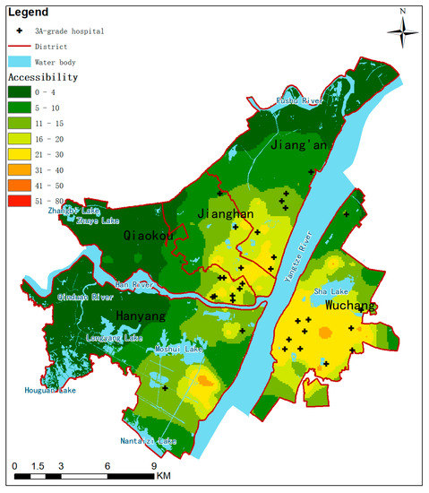 The word “Accessibility” indicates the quality of being easy to reach, enter or use. In discussions of the health care systems, it specifies a multidimensional concept which includes the meanings of affordability, acceptability, availability and spatial accessibility [1]. It is closely related to our daily life and work, and research on it has continued for a long time [2]. The accessibility of medical services is an important measure of the equity of medical care for the population, which guarantees the rights and interests of citizens. At the same time, it helps to optimize the allocation of medical resources, promotes the equitable development of medical services, and improves the overall level of medical services. Often, it is used to identify lower (or higher) access rates from some areas to others, such as in public policies for planning and providing services [3,4].