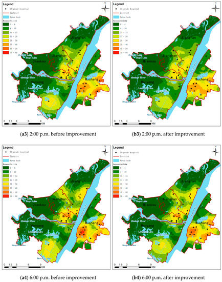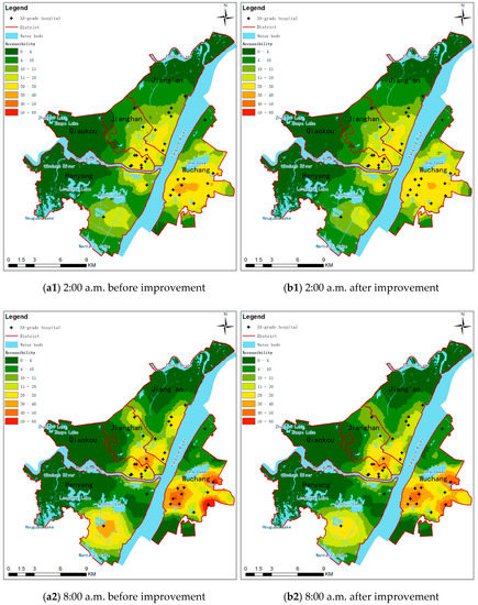 Comparing the calculation results of the two methods, the accessibility of medical facility services in the areas near the confluence of the two rivers is better at all four moments of the day, with some areas in the Wuchang District being the best. Meanwhile, the accessibility of areas near hospitals is also better. As the distance increases, the accessibility decreases accordingly. Overall, on the one hand, the temporal and spatial distribution patterns of accessibility before and after improvement are roughly the same. On the other hand, the local changes were also very obvious. This is mainly reflected in the narrowing of the accessibility gap between different areas, the significant reduction of high accessibility areas, the decrease of accessibility in areas around hospitals, and the increase in accessibility in areas between multiple hospitals. For example, as shown in Figure 5, in the eastern part of Wuchang, the accessibility at 8:00 a.m. decreased from 50–90 (a2) to 40–50 (b2) after improvement, which also made the spatial variation of accessibility at each moment smoother.