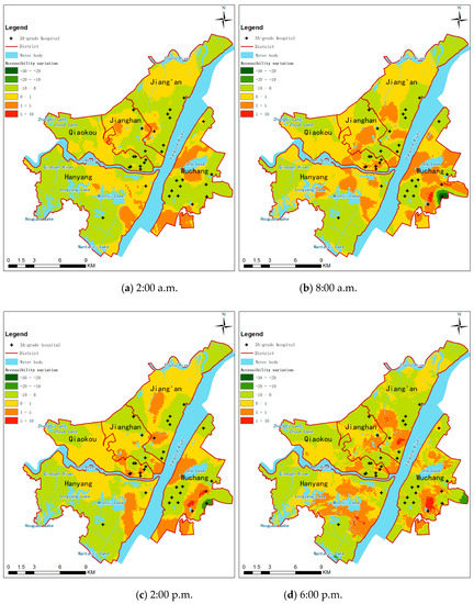 As shown in Table 2, the accessibility calculation results were divided into six classes, namely {(−30,−20), [−20,−10), [−10,0), [0,1), [1,5), [5,10]}, and then the proportion of area covered by each classification was calculated. On the one hand, the largest proportion of relatively small changes in area, such as [−10,10], the smallest proportion was 99.42% at 18:00 p.m., and the largest proportion was 100.00% at 2:00 a.m., which indicates that the improved method does not have too much impact on the accessibility of the whole study area. On the other hand there was also a greater variation of about twice as much, such as the presence of (−30,−20) at 8 a.m., although the area proportion is only 0.23%. This also reflects, to some extent, that the improved method responds to the effects of complex road conditions.