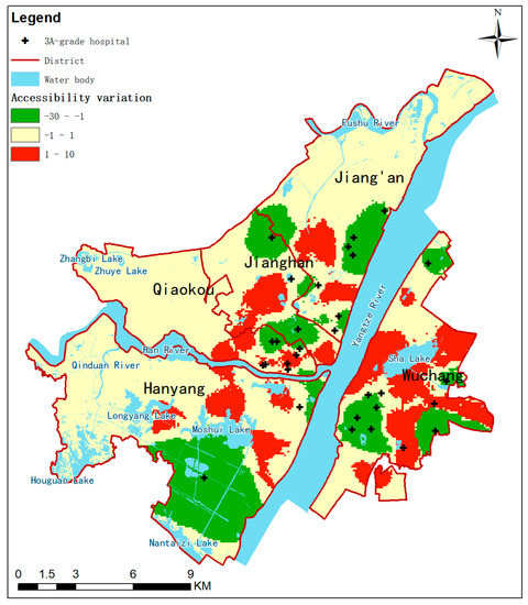 The improved accessibility interpolation results were subtracted from the pre-improved accessibility interpolation results to obtain the changes, as shown in Figure 6. The change after improvement was global and uneven, but the overall amount of change was not significant. In general, the areas around the study area and near the hospitals became worse, while other areas got better. Regardless of whether it got better or worse, there were very few areas with large changes.
