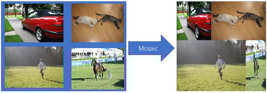 The YOLOv4 network uses Mosaic data augmentation at the input. The principle is to select 4 pictures in the dataset, and then place the four pictures in the four corners of a canvas after scaling, rotating and color gamut changes. The advantage is that this can enrich the background information of the entire detected object, and can calculate all the data of 4 pictures at the same time when calculating the picture. The Mosaic data augmentation is shown in Figure 2.
