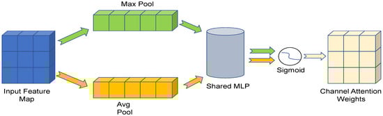 Perform a maximum pooling and an average pooling operation on the input feature map in the spatial dimension, respectively, and then pass the pooled output through a shared weight MLP (multi-layer perceptron), and then also output the elements of the two outputs one by one. After the elements are added and passed through the sigmoid function, the channel attention weight is obtained. The formula of the channel attention module is shown in (1).