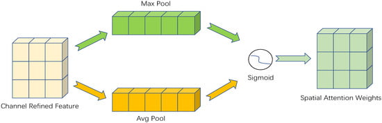 Perform a maximum pooling and average pooling operations on each channel of the Channel refined feature map, and then concatenate those two pooled feature maps, convolution operations and sigmoid activation will be performed on the spliced feature maps. After the above operations, a spatial attention weight with a channel of 1 and the same size as the input feature map can be obtained; finally, an element-by-element multiplication with the input feature map is performed. The formula of the spatial attention module is shown in (2).