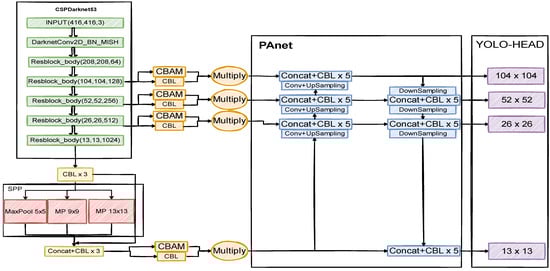 In this paper, the convolutional attention module is integrated into the feature output layer of each dimension output by the CSPDarknet backbone network, and the output feature after spatial pyramid pooling. It makes the network pay more attention to key pixel features when predicting different feature layers, and improves the prediction accuracy of the network. The improved YOLOv4 network structure is shown in Figure 5.