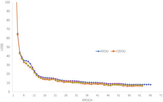 In the third set of experiments, in order to verify the optimization effect of CEIOU loss in the training phase, EIOU and CEIOU were used to train the same dataset with the same training parameters in the frozen training phase. The obtained loss value comparison chart is shown in Figure 9.
