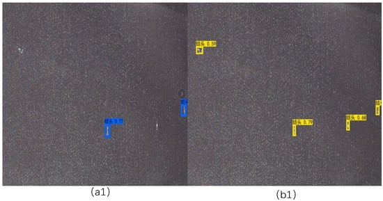Experimental results of group1. (a1) detection result of YOLOv4; (b1) detection result of improved YOLOv4. Defect sizes are about 3 × 8 pixels.