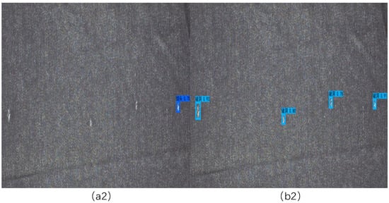 Experimental results of group2. (a2) detection result of YOLOv4; (b2) detection result of improved YOLOv4. Defect sizes are about 4 × 12 pixels.