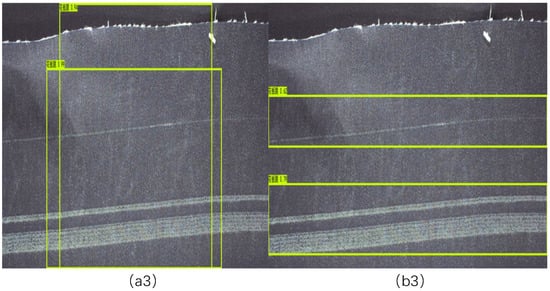 Experimental results of group3. (a3) detection result of YOLOv4; (b3) detection result of improved YOLOv4. Defect sizes are about 416 × 90 pixels.