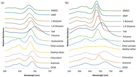 In the UV-Vis spectra of 6 (Figure 1a) and 7 (Figure 1b) recorded in dichloromethane, acetone, chloroform, diethyl ether, and ethyl acetate, intense Q-bands were considerably split into two components. The split was less marked for the other solvents, such as acetonitrile, toluene, THF, 1,4-dioxane, 1-butanol, DMF, and DMSO. Therefore, solvent effects on UV-Vis absorption spectra were studied in selected protic and aprotic solvents. In the Q-band region, depending on the applied solvent, the positions and intensities of the bands were influenced. For 6, the largest red shift was noted in toluene, whereas the highest blue shift was observed in DMSO. For 7, the largest red shift was noted in dichloromethane, and the highest blue shift was observed in 1,4-dioxane, DMF, and DMSO.