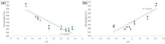 Figure 2. Plots of the wavelength of the Q-band maximum absorbance vs. the rational function of the solvent’s refractive index (1/F) for 6 (a) and 7 (b). Solvents used: (1) dichloromethane, (2) acetone, (3) chloroform, (4) diethyl ether, (5) ethyl acetate, (6) acetonitrile, (7) toluene, (8) THF, (9) 1,4-dioxane, (10) 1-butanol *, (11) DMF, and (12) DMSO; *—correlation was not found, therefore not added to the figure.