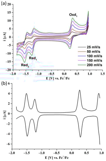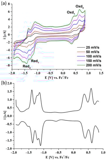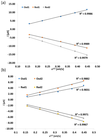 What is more, all oxidation and reduction processes in 6 (Figure 6a) and 7 (Figure 6b) are diffusion-controlled due to a linear correlation of the peak currents of the redox pairs versus the square root scan rate.