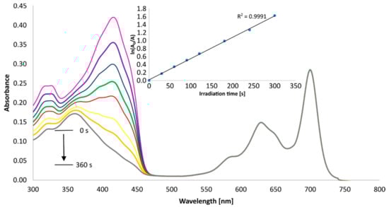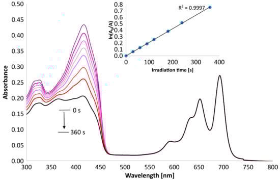 To assess the potential application of the new tribenzoporphyrazines in photodynamic therapy, the quantum yields of singlet oxygen generation in DMSO were measured spectrophotometrically using an indirect method with 1,3-diphenylisobenzofuran (DPBF). DPBF is a compound that easily reacts with singlet oxygen, with a breakage of furan ring, and its peak at about 400 nm decreases over time (Figure 7 and Figure 8) as it decomposes. The changes in absorption were than calculated to give singlet oxygen quantum yields (Φ). As a reference, zinc(II) phthalocyanine was used. Compound 6 generated oxygen with a quantum yield value of 0.24, which indicates the moderate photosensitizing potential, whereas 7 presented an even higher quantum yield, reaching the value of 0.59. The measured singlet oxygen generation values can be considered as high compared to those previously obtained for the studied magnesium(II) 3 and 4 analogs and other porphyrazine derivatives presented in the literature (Table 4). It was found by Gierszewski et al. [38] that porphyrazines with eight peripheral isophtaloxyalkylsulfanyl substituents generate singlet oxygen with Φ values between 0.01 and 0.04 in DMF and that incorporating Mg2+ ions into the Pzs improves their capability to generate single oxygen. The exchange of Mg2+ (3, 6) to Zn2 (4, 7) in the tribenzoporphyrazine ring influenced the singlet oxygen generation quantum yield values, which increased from 0.05 (3) to 0.24 (4) and from 0.20 (6) to 0.59 (7). In Figure 7 and Figure 8, the Q-bands of 6 and 7 demonstrate only minimal to no changes during irradiation, thus indicating their good stability during measurements.