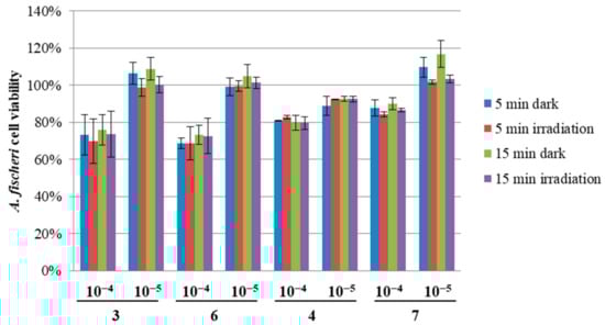 In the acute toxicity test, the changes in bioluminescence are correlated with Aliivibrio fischeri bacterial metabolism. The luminescence linearly decreases with the increasing toxicity of an added sample. Compounds 4 and 6 induced no changes in the cell viability after exposure to red light in comparison to dark conditions, as can be seen in Figure 9. Quite the opposite effect can be observed for 3 and 7, in which case the cell viability was lower after irradiation. On the other hand, the values obtained for 3 present much higher variability, which suggests that they should be treated with caution. Additionally, such results are somewhat unusual, as they cannot be associated with higher singlet oxygen generation yields (Table 4). However, it can be seen that in all cases the higher concentration of the macrocycles (10−4 M) induced dark toxicity. Based on the results obtained earlier for the magnesium derivatives on bacterial strains and cancer cell lines [20,39], this toxic effect was probably caused by the absorption of the emitted bacterial bioluminescence at 490 nm by the macrocycles or was a result of the specificity of the test.