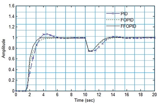 Simulation studies for the selected system model are conducted using MATLAB software to validate the performance of the suggested control strategy. Figure 5 shows the system response for unit step input using a normal PID controller, a FOPID controller, and a FFOPID controller. The FFOPID controller’s initial gain settings are determined by the FOPID controller parameters. Figure 5 demonstrates that the FFOPID controller outperformed the different type of controllers in terms of step response. Because of the online gain adjustment, it is clear that the fuzzy mixed fractional-order PID controller settles system output faster than different types of controllers.