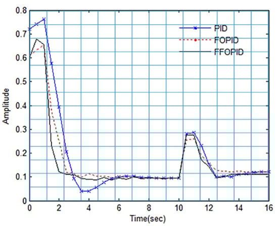 The FFOPID controller quickly follows the parameter variations and brings the system to a steady state condition, as seen by the load disturbance response. Figure 8 and Figure 9 exhibit the controllers’ performance for set-point change, associated with control signals for various control schemes. It has been discovered that the suggested FFOPID control scheme adapts to new set point values better than other kinds. Table 3 shows a mathematical comparison of several controllers utilizing settling time, overshoot, and error criteria. The FFOPID control scheme is superior for the specified application, according to the results.