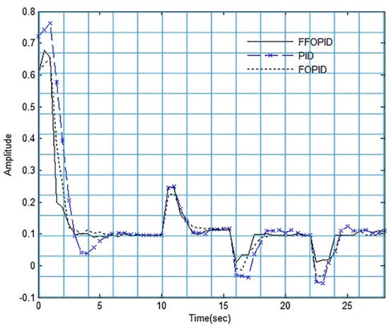 Load disturbances are supplied in steady state to test the controller’s resilience for pressure control applications. Figure 6 depicts the outputs of different controllers for load disturbances, whereas Figure 7 depicts the corresponding control signal of various controllers for load disturbances.