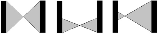 The solid angle for detecting pairs of back-to-back photons is maximum for a source at the centre of the FOV (left). As the source moves transverse to the detectors, the angular acceptance falls approximately linearly (centre). Movement of the source along the axis between the detectors leads to a smaller reduction in angular acceptance, which is limited by the solid angle of the farther detector (right).