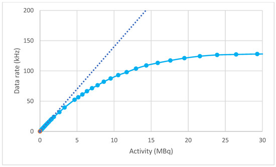 Coincidence data rate recorded from the ADAC Forte for a central 11C source of varying activity. The dotted line corresponds to a sensitivity of 1.4%.