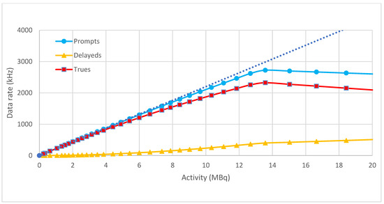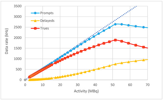 As the activity increases, the effective sensitivity drops due to increasing dead time. Note that the important rate is that of true coincidences—fortuitously, when considering the total prompt coincidence rate the effect of dead-time is almost balanced by the increasing contribution of random coincidences. Although its presence is clear, dead time is actually quite modest—at an activity of 10 MBq the true coincidence rate (approximately 1.87 MHz) is only 15% lower than that predicted on the basis of 22% sensitivity. Moreover, at this activity, random coincidences contribute only 11% of the total prompt coincidence rate.