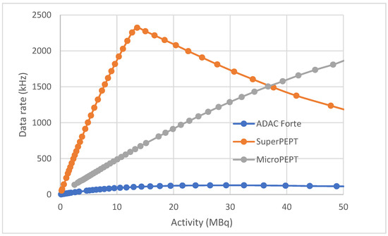 Figure 8 compares the data rates of the three systems as a function of source activity for a central source. For both SuperPEPT and MicroPEPT, the value plotted is the true coincidence rate, obtained as the difference between the rates of prompt and delayed coincidences. The curve for the ADAC Forte shows the total prompt coincidence rate, so overestimates the trues rate.