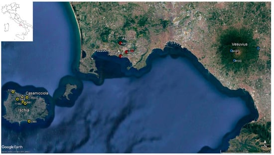 Map of the Neapolitan volcanoes (Vesuvius, Campi Flegrei, and Ischia) with the seismic stations (circles in blue for Vesuvius, red for Campi Flegrei, and yellow for Ischia) used for the analysis.