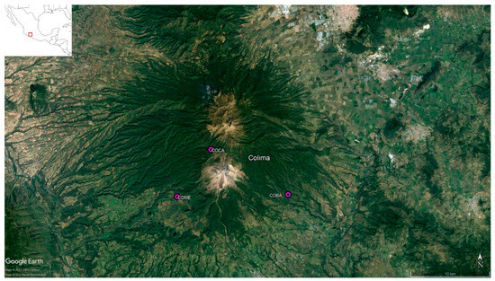 For the Campi Flegrei caldera, we selected data recorded in 2006, when a relevant low-frequency hydrothermal component in the background seismic signal was evidenced by [36] and interpreted as related to fluid injections from a deeper geothermal reservoir toward the shallower hydrothermal system of the Solfatara. On Ischia, we considered samples recorded after the Mw 3.9 earthquake, which occurred on 21 August 2017, when the hydrothermal source was particularly active and its persistent signature was identified in background noise [9,25]. At Vesuvius, the seismic noise was (randomly) sampled during the first months of 2019. At Colima volcano, data were collected in 2006, during a temporary seismic survey organized by the Istituto Nazionale di Geofisica e Vulcanologia (INGV)–Osservatorio Vesuviano, the Observatorio Vulcanologico de Colima of Colima University (OVC) and the Instituto Andaluz de Geofisica (IAG), University of Granada, Spain [51]. We used seismograms recorded by three digital seismic stations (COME, COCA, and COBA) consisting of broadband three-component seismometers Lennartz LE-3D/20 s; the sampling rate was at 62.5 Hz. A map with the location of the stations and the investigated area (Colima volcano) is reported in Figure 2.