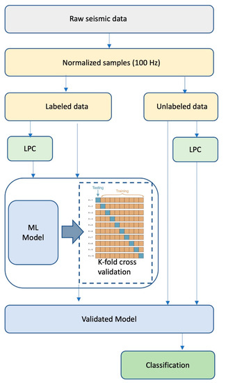 Figure 3 shows the dataflow of our high-level processing for noise background classification. The raw data, i.e., the background seismic signals from the presented volcanoes, are preprocessed, splitting it into separate time windows lasting 24 s (20 s devoted to the event signal and 4 s due to the overlapping windows). Due to the different types of acquisitors gathered from the stations, the raw signals were resampled at 100 Hz to get the sample normalization. This normalization process is described in [34]. The samples are separated into two parts: one for ML model training and validation and the other part called unlabeled data is the unseen signals that will be classified by the ML model once trained.