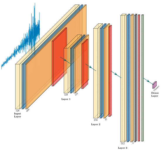 The proposed CNN is composed of four-layer blocks; each block includes a convolution one-dimension layer, the batch normalization operation, the ReLU activation function, and, finally, a MaxPooling operation. As shown in Figure 4, the initial convolutional layer has 128 filters used for our time-series data of size 2400, a kernel size of 80, and a stride of 4. The Xavier (also known as Glorot) uniform initializer was used to randomly initialize the weights of the layer. This block structure appears three times but with 128, 128, and 256 filters, respectively, in the layers called input layer, layer 1, and layer 2 in Figure 4. Layer 1 and layer 2 have instead a kernel size of 3 and stride 1. Finally, layer 3 has a similar design but uses 512 filters, with a kernel size 3 and stride 1. This last block also provides a dropout layer with 50% probability to avoid overfitting along with a Lambda “mean” layer. Finally, a dense layer with softmax activation provides a three-neurons output layer. The proposed CNN model architecture traced approximately 558,597 parameters on the samples trained to perform the classification.