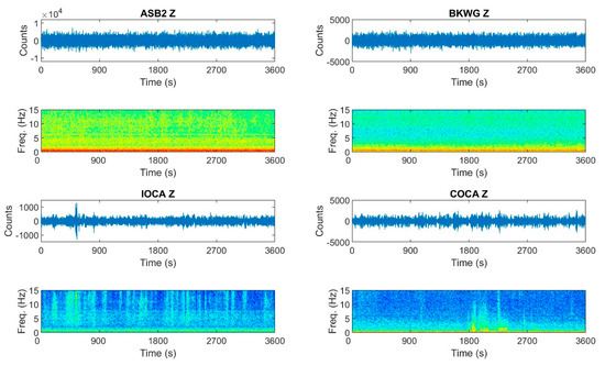 Examples of waveforms of the seismic noise recorded at the Neapolitan and Colima volcanoes are shown in Figure 5 and Figure S1–S5. As one can observe, the noise has different amplitude levels and frequencies depending on the volcano, on the specific site where the station is located, and on the component of motion.
