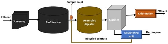 In this study, The wastewater samples were taken from the biofiltration stream that goes into a bio-digester and clarifier at a sugar refinery wastewater treatment plant in Durban, KwaZulu–Natal, South Africa. This sample point (Figure 1) had a mixture of dewatered centrate with less than 5% solids and biofiltration effluent. The supernatant was employed as substrate in this experiment, whereas the digested sludge was used as inoculum. The magnetite photocatalyst (Fe-TiO2 NPs) used was engineered and characterised at a high magnification of 10–50 kx and landing energy capacity of 20 keV and, as depicted in our previous studies [], had a surface and average crystallite size of 6.5 mm and 20 µm [,]. Characteristics of the wastewater sample is presented in Table 1.