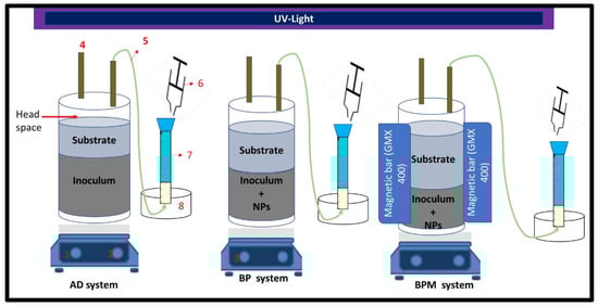 Experimental setup protocols were adapted from Kweinor Tetteh and Rathilal [] and Tetteh and Rathilal []. Figure 2 presents the experimental setup employed in this study. Three 1-L Duran Schott bottles used as bioreactors were coupled with UV-light (T8 blacklight-blue bulbs 400 nm, Philips, Netherland), a hotplate magnetic stirrer (temperature regulator), and biogas collection system. Each duplicated reactor was charged with 80% working volume of inoculum to substrate ratio of 3:5 seeded with or without a magnetic photocatalyst of 2 g of Fe-TiO2 NPs. Herein, these bioreactors, defined as control (AD system with no NPs), biophotoreactor (BP system with NPs) and biophotomagnetic (BPM system with NPs), were operated at a hydraulic retention time (HRT) of 30 days at a temperature of 40 °C and intermittent mixing at 15 rpm. Two magnetic bars (GMX model 400) used on the BPM system was obtained from Chino, California, USA. The daily biogas was monitored by downward displacement techniques, while its composition was characterised by Gas Chromatography (GC 2014, Shimadzu). The degree of efficiency of the contaminant removal and the modified Gompertz kinetic model for the biogas production were respectively estimated by Equations (1) and (2).