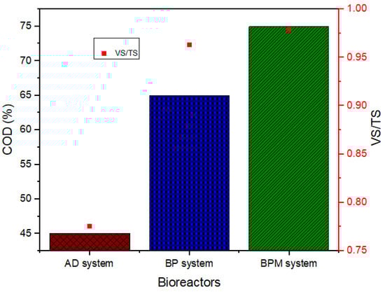 Bioreactor performance for COD removal (%) and VS/TS reduction ratio after 30 days of incubation.