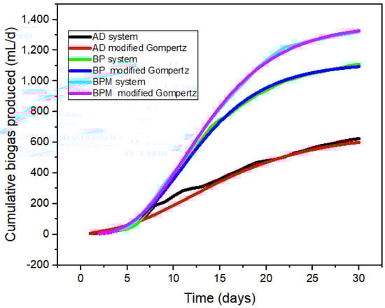 Bioreactor cumulative biogas production fitted with modified Gompertz kinetic model for the 30-day incubation.