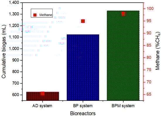 After the HRT of 30 days for methanogenesis, the biogas composition was characterised as showing a high methane yield greater than 65% in the increasing order of the systems as AD < BP < BPM. As shown in Figure 5, there was an impact in both the biogas and methane of the BP and BPM systems. There was partial degradation in the AD system, which is consistent with previous studies that showed the AD process to be kinetically unstable with a general methane potential of 50–65% [,,].