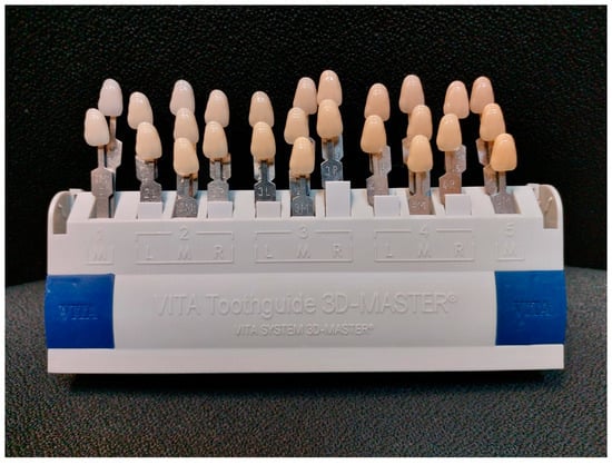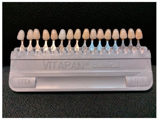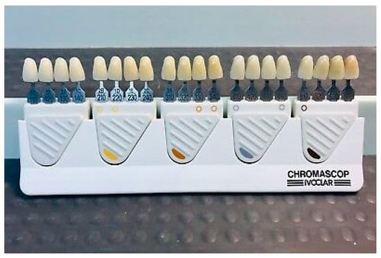 - Todorov, R.; Yordanov, B.; Peev, T.; Zlatev, S. Shade guides used in the dental practice. J. IMAB 2020, 26, 3168–3173. [Google Scholar] [CrossRef]