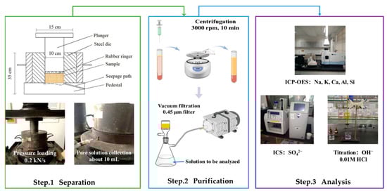 The pore solution separation and analysis were conducted to provide the essential input data for the thermodynamic model. The pore solution was separated using a steel die under high pressure. The separation was carried out in a press machine with a pressure loading rate of 0.2 kN/s and a maximum pressure of 300 kN. The pore solution was first collected with a disposable needle and then subjected to centrifugation and filtration. The OH− concentration in the pore solution was titrated, the concentration was determined using an ICS-1100 ion chromatograph and the concentrations of Na, K, Ca, Al and Si were determined using an Agilent (Santa Clara, CA, USA) 5110 that was inductively coupled with a plasma emission spectrometer (ICP-OES). Then, the activities of the aqueous species were automatically determined using their corresponding Keq values and PHREEQC. A graphic abstract of the aforementioned procedure is presented in Figure 1.