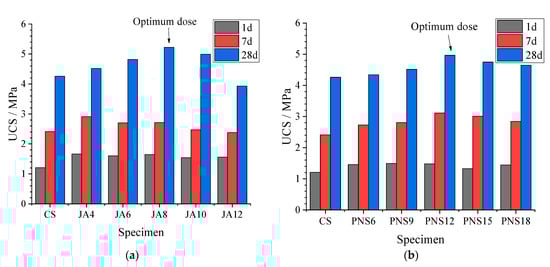 Figure 2a,b compare the UCS values of the JA group to the CS specimen and those of the PNS group to the CS specimen, respectively.