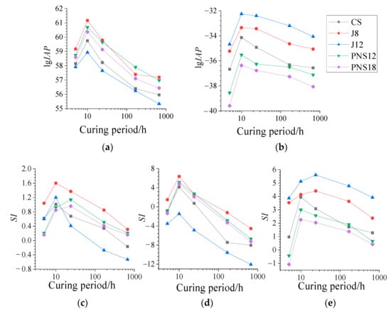 With the pore solution data, the modeling results were calculated. The compositional minerals within the cement-stabilized soils were fully considered in the current thermodynamic model. To simplify the analyses, montmorillonite and C3S were used to represent the reactants in the mineralogy of the raw materials, CSH and AFt were used to represent the cement hydrates in the crystallinity and fractions of the hydrates and natrolite was used to represent the pozzolanic products since Na+ is the most abundant of the exchangeable cations in soil. The lgIAP values for the reactants montmorillonite and C3S, from 5 h to 672 h, are summarized in Figure 3a,b, respectively. The SI values for the products CSH, AFt and natrolite are summarized in Figure 3c–e, respectively.
