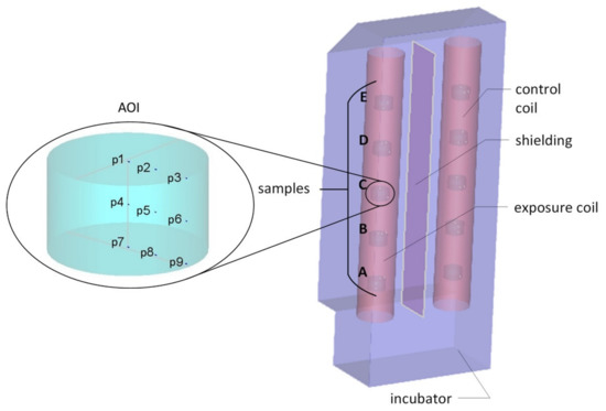 The model includes two identical applicators—the exposed one and the control one, shielding between the coils, a metal incubator and ten samples representing the AOI, all depicted in Figure 2. The shielding with dimensions 1000 × 160 mm2 (height × width) is placed exactly in the middle between the coils. The distance between the edges of coils is 174 mm.