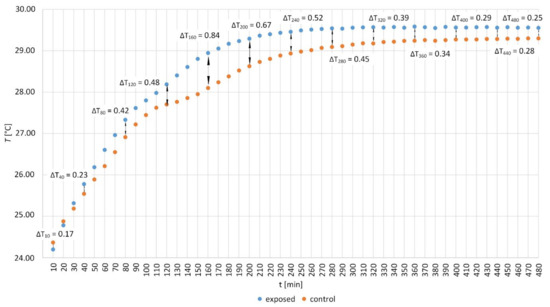 The low temperature of 24 °C occurring at the start of each experiment is caused due to the opening of the incubator door and manipulation with samples. During the 8 h lasting experiment, the door remains closed. The temperature difference stabilizes after 4 h (ΔT260) from the start of the experiment, where the temperature difference between control and exposed samples is less than 0.5 °C, and it is no longer increasing.