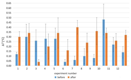 The temperature of the YPD medium in exposed and control samples is measured before and after each experiment using the conductometer PC 70 Vio. The average YPD temperature difference between control and exposed samples A-E in 12 experiments before and after the experiment is shown in Figure 12.