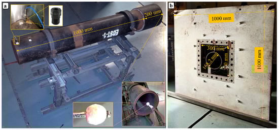 HME are improvised, they are extremely diverse in design and can come in many forms, ranging from a small pipe bomb (practical option for terrorists) to a sophisticated device capable of causing massive damage to people and infrastructure [23]. Most of IEDs used in terrorist attacks are either spherical or cylindrical in shape. The enhancements added to the explosive charges differ in mass, shape, and geometry from one configuration to another. The full range of possibilities in the shape and the mass of the charge, together with the geometry, shape and mass of the fragments is considered as one of the great difficulties in IED research [13,19,20,21]. Therefore covering the whole range of possibilities in a laboratory-scale experiment is not realistic. In this paper, the choice is made to use a spherical steel projectile with a variable diameter attached to the front surface of a spherical explosive charge. Steel spheres with diameters of 5, 7, and 8 mm are half buried into the radial center of the front surface of the charges. C4 explosive charge masses of 10, 20, and 30 g are positioned at the entrance of the EDST. This choice is made to cover a specific configuration range that usually observe in real scenarios. The EDST is based on a cylindrical steel tube with a length of 1200 mm, a wall thickness of 4.5 mm and an inner diameter of 168.2 mm. The tube is reinforced at its entrance, over the first 200 mm, with a second steel tube. The latter has a 4.5 mm thickness and an inner diameter of 193.7 mm. Steel fiber-reinforced concrete is used to fill the radial space between the two tubes [24]. It is used to strengthen the region where the highest pressures occur. The EDST is mounted on a steel structure to allow for a controllable height from the ground as shown in Figure 1a. A steel frame with dimensions of 1000 mm × 1000 mm × 15 mm is placed at the exit of the tube. It is rigidly fixed to the ground and has an opening of 300 mm × 300 mm as shown in Figure 1b. This opening will hold a witness plate that will be subjected to the combined effect of blast wave loading and projectile impact.