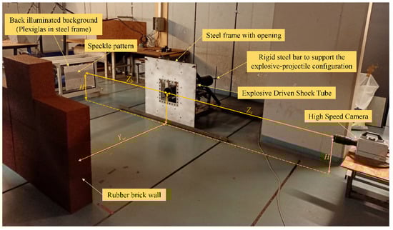 A high-frequency pressure sensor [25] is placed at 20 mm from the exit of the EDST. It is used to record the incident pressure as well as the blast wave front arrival time. The pressure sensor is mounted on a special adaptor [25], which is used to attenuate the vibrations in the EDST wall resulting from the explosion. An image of the experimental setup showing all equipment is shown in Figure 2. An SA5 photron fastcam digital camera is positioned at a distance of 2350 mm from the center point of the tube. The camera is focused on a steel frame with plexiglas, which is positioned on the same optical axis at a distance of 1945 mm from the tube’s center. A frame rate of 20,000 fps (frame per second) and a shutter speed of 6.42 s are chosen together with a picture resolution of 704 × 520 pixels in order to measure the projectile velocity at the exit of the tube. A black and white speckle pattern, printed on a transparency film, is attached to the plexiglas [26]. Additionally, the speckle pattern is back-illuminated using two 575 W halogen lamps. A wall composed of thick rubber bricks is placed at a distance of 1885 mm from the tube’s center. It serves to retain the steel spheres after the explosion and to record their impact points. The main aim is to extract conclusions concerning the projectile flight trajectory and the dispersion of impacts.