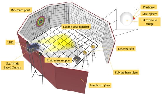 The experimental setup consists of nine polyurethane plates with dimensions of 1000 mm × 1220 mm × 50 mm attached to the same number of 80 mm thickness hardboard panels. They are arranged to form an octagon with a diameter of 2150 mm as shown in Figure 3. The polyurethane allows a good visibility of the projectile’s impact point. A total of 23 tests are carried out [27]. A detonator and a rear-detonated C4 spherical explosive charge are used to accelerate the selected projectile. A distance of 910 mm separates the charge from the target. Steel spheres with diameters of 5, 7, and 8 mm are used. A steel bar is used for the fixation of the detonator-projectile configuration. An SA5 photron fastcam digital camera is positioned at a distance of 2150 mm from the center of the explosion. The HSC is configured with a frame rate of 50,000 fps and a shutter speed of 1/1,000,000 s. A view from the top enables to track a part of the projectile’s trajectory. Two 1500 W light emitting diodes are used to increase the illumination of the setup.
