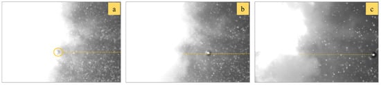 A typical result at different time steps of the flight trajectory of a 7 mm diameter projectile is shown in Figure 4. First, the projectile is accelerated by the blast wave generated by the explosive. The projectile’s initial trajectory is hidden by the flash of the detonation. After its passage through the opaque gas cloud, the first appearance of the projectile is captured as shown in Figure 4a. A straight trajectory visualized by the yellow dashed line can be tracked. A straight trajectory can be seen as shown in the images corresponding to Figure 4b,c. At the end of its straight flight in the air, the position of the projectile impact on the target is recorded.