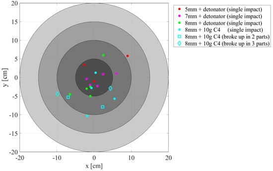 Representation of the dispersion of projectile impacts on the target using varying spheres (5, 7, and 8 mm) attached either to only a detonator or to a 10 g C4 spherical explosive charge.