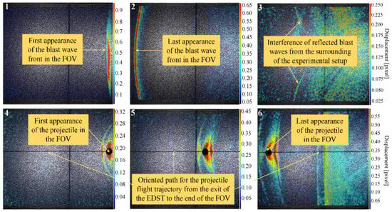 In this phase, the setup of Figure 2 previously explained in Section 2.1 is used. The flight trajectory of 5 and 7 mm diameter projectiles propelled by 10, 20, and 30 g C4 explosive charges is tracked. It should be highlighted that a reproducible oriented path of the projectiles allows for a better extraction of their velocities, arrival times, and consequently . For a better visualization of the passage of the blast wave front and the projectile in the field of view (FOV), images are processed using the particle image velocimetry (PIV) visualization technique [30]. This optical measurement technique is able, not only to provide quantitative data for the multiphase and transient characteristics of flows, but also to determine the spatiotemporal evolution of the shock wave and the projectile in all different flight phases.